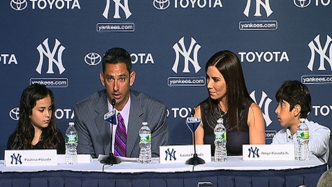 Con Rivera y CC Sabathia en la multitud, Posada comenzó su rueda de prensa citando a Joe DiMaggio: "Quiero darle las gracias a Dios por convertirme en un yankee".